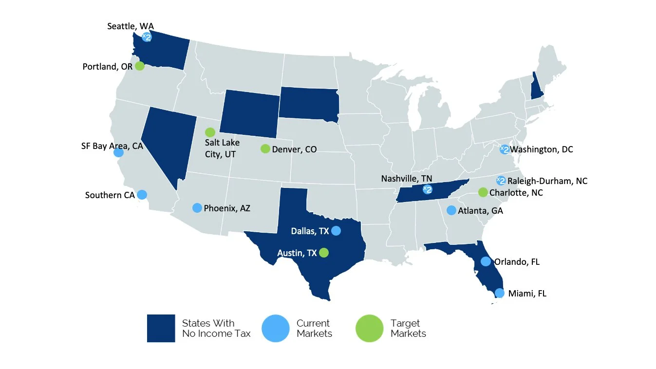 We consider markets with growing economic fundamentals, strong in-migration trends, a low cost of living, and business-friendly characteristics. Our markets have strong demographic trends and are beneficiaries of major commercial and infrastructure investment. In evaluating assets, we emphasize the importance of amenitized locations offering a live/work/play experience for tenants.